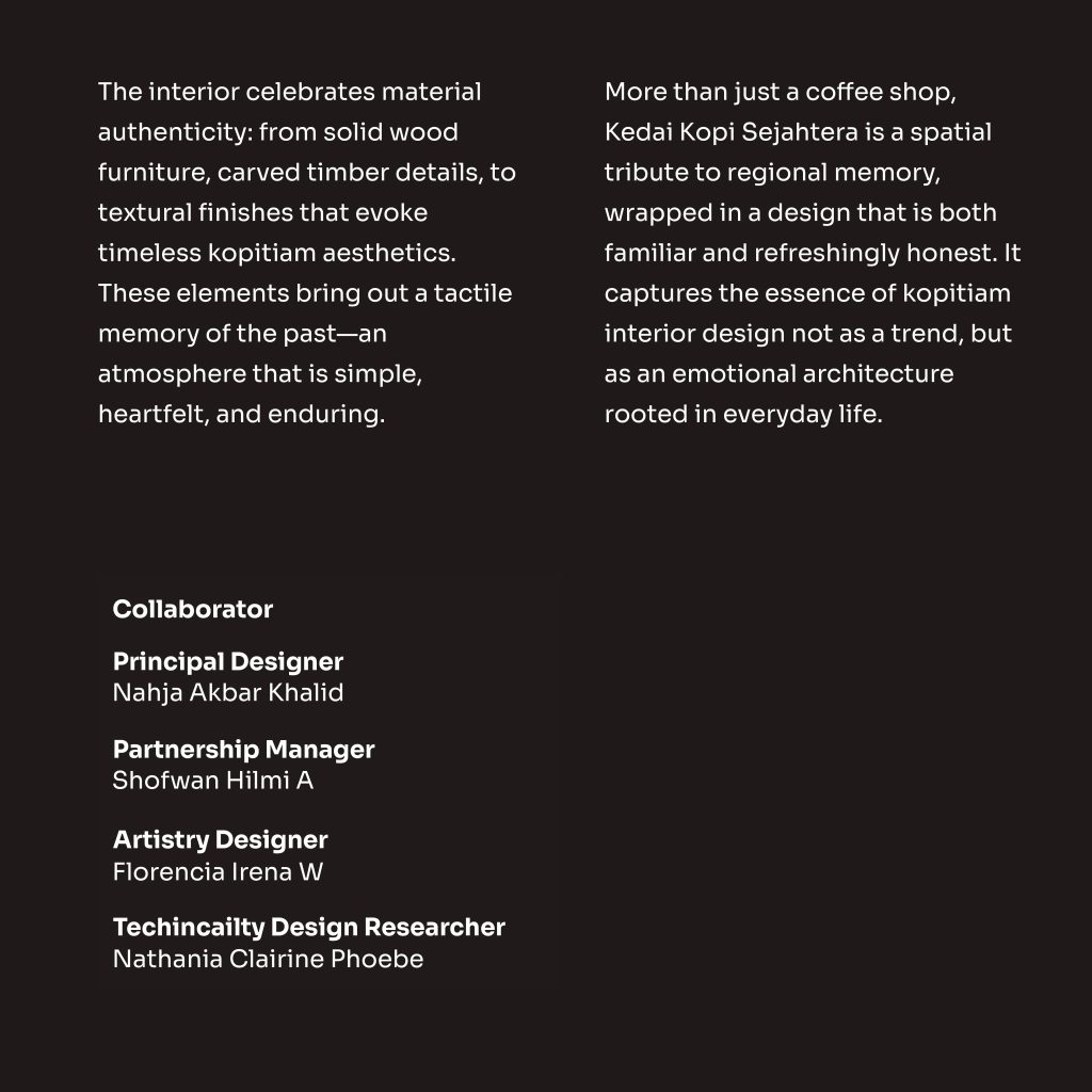 Kedai Kopi Sejahtera is a nostalgic reinterpretation of the traditional Southeast Asian kopitiam interior design, brought to life by entrepreneur and content creator Arief Muhammad. Located in Karawaci, this coffee shop blends the personal memories of childhood in Batam with a warm and grounded spatial experience.